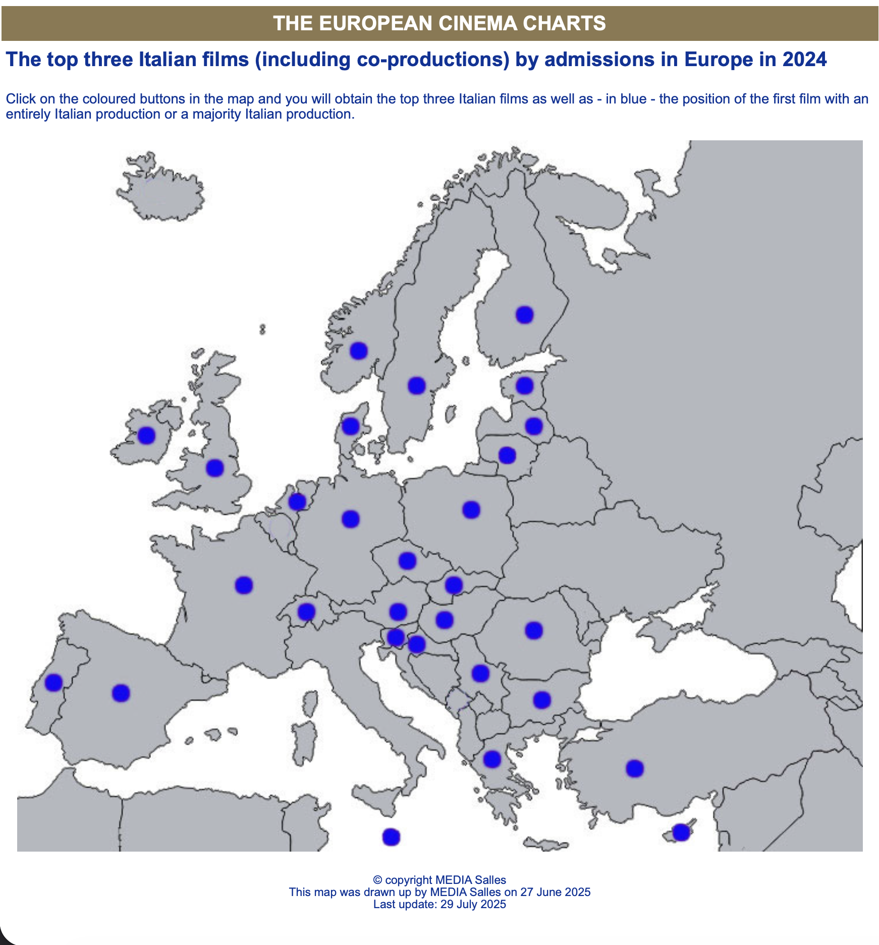 The map below provides a simple click to understand the distribution of Italian cinema in 28 European territories in 2024.